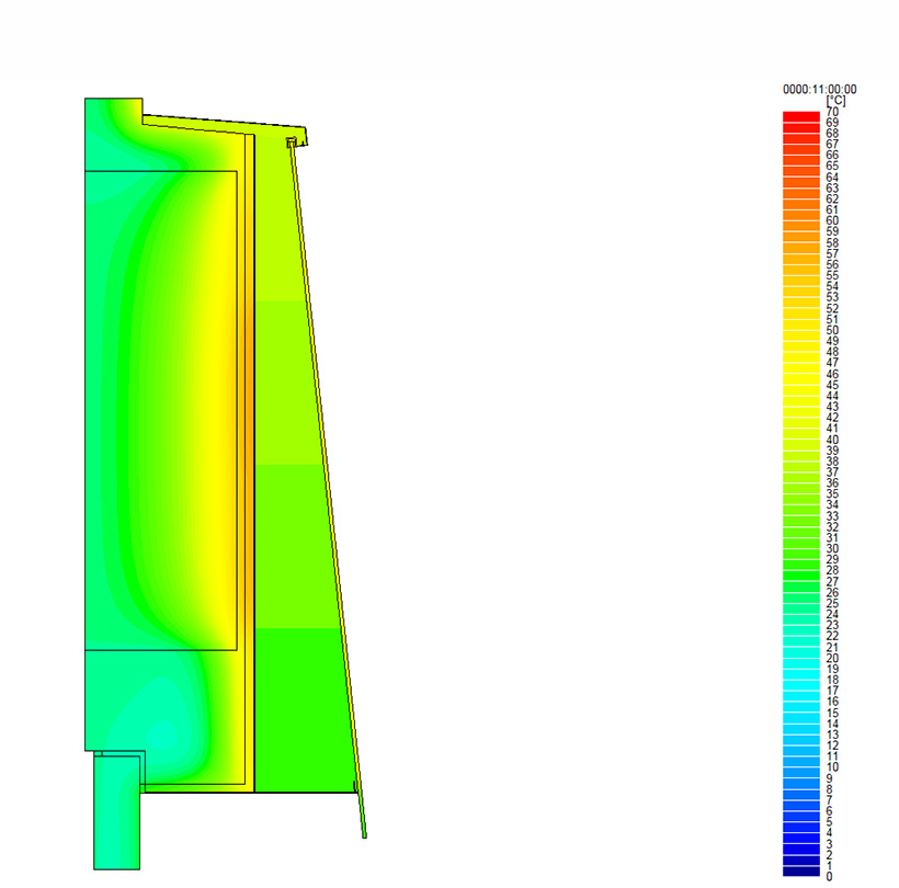La variation des températures de chaque composant soumis au rayonnement solaire sur une période prédéfinie est obtenue grâce à un modèle géométrique à éléments finis de forme libre. Ce type de modélisation permet de vérifier les variations de température dans les composants, notamment les éléments verriers, dans le cas de mises en œuvre non conformes au DTU 39. Cette analyse détaillée permet d’évaluer le risque de casse thermique du vitrage. De plus, ce modèle répond également aux analyses thermiques dynamiques des gains de mur de type Trombe, avec une visualisation dynamique des températures d’entrée et de sortie en fonction de plusieurs paramètres tels que l’orientation et la couleur.